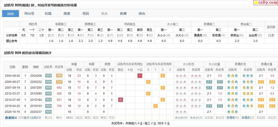 237期福彩3D试机号909对应开奖号的组选分析结果