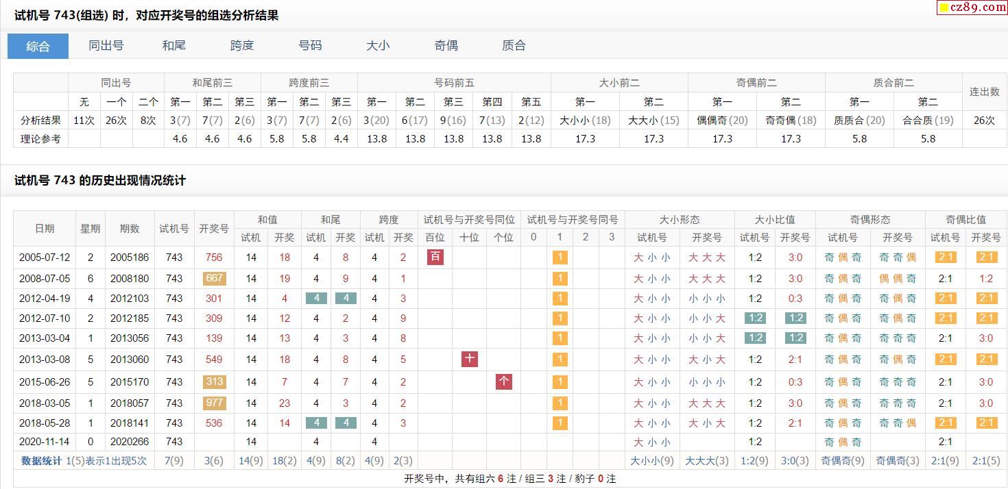 266期福彩3D试机号743对应开奖号的组选分析结果