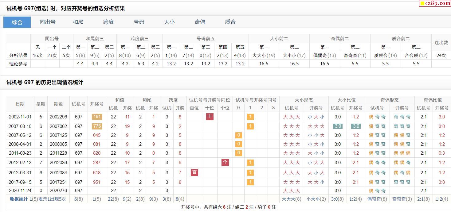 276期福彩3D试机号697对应开奖号的组选分析结果