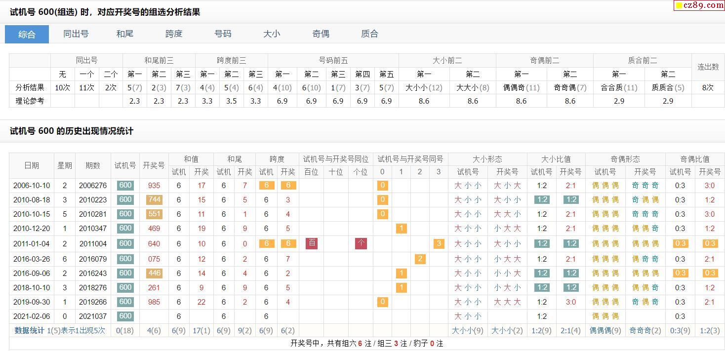 037期福彩3D试机号600对应开奖号的组选分析结果