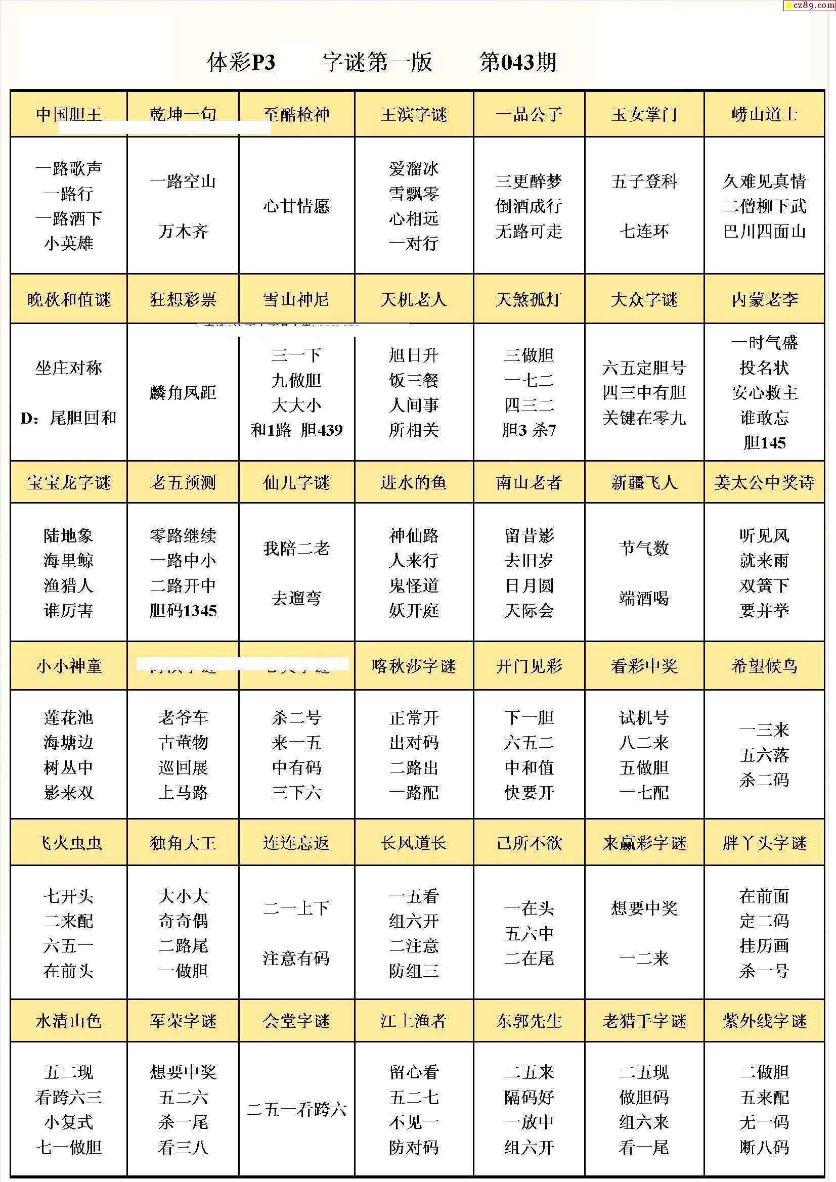 p3字谜汇总2021年043期牛彩版体彩p3今日字谜汇总