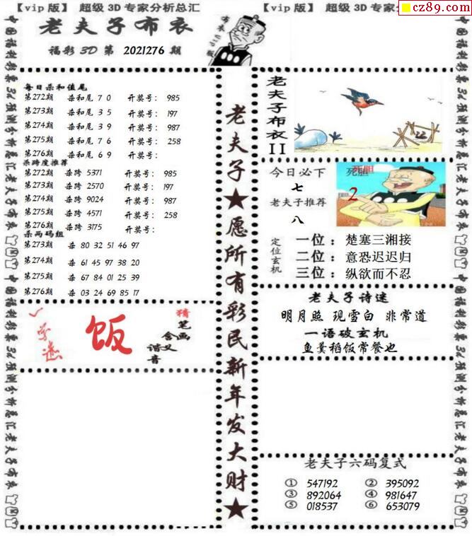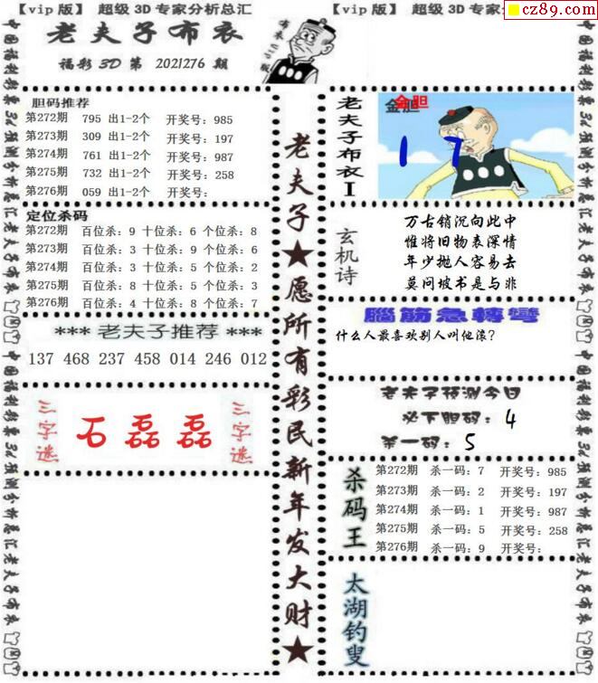 老夫子布衣2021276期3d图谜