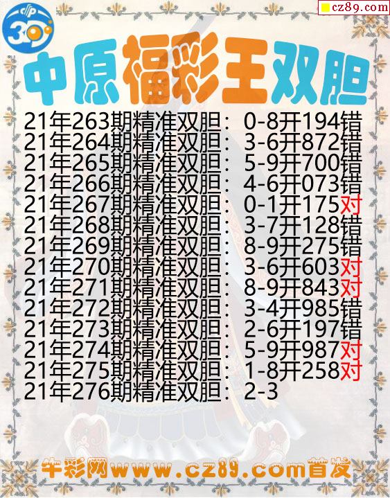 中原福彩王双胆276期3d图谜