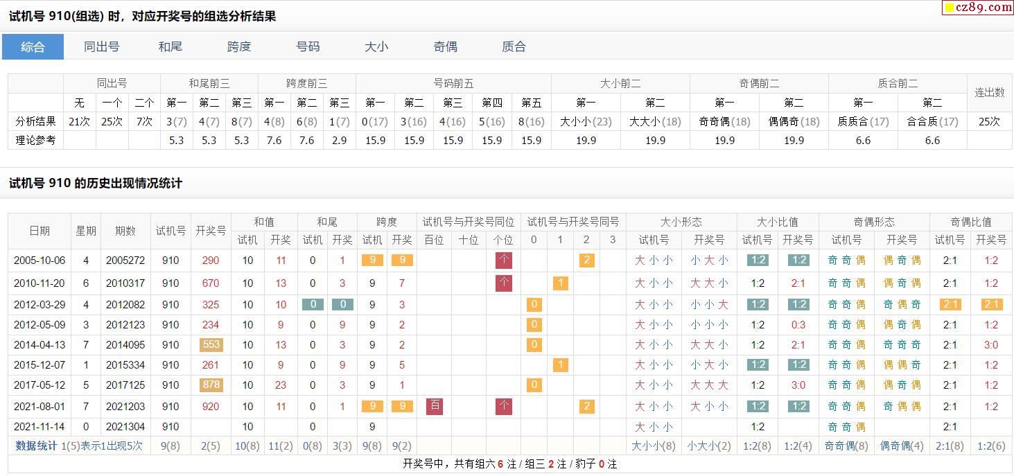 304期福彩3D试机号910对应开奖号的组选分析结果