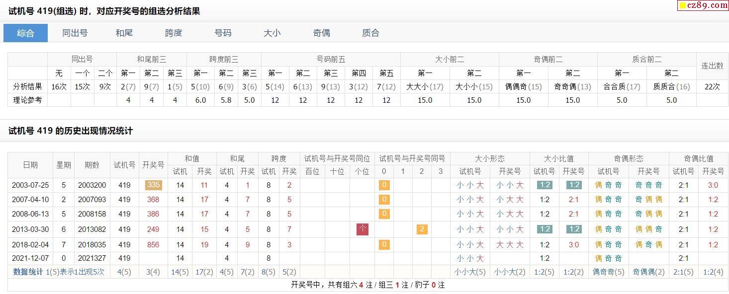 327期福彩3D试机号419对应开奖号的组选分析结果