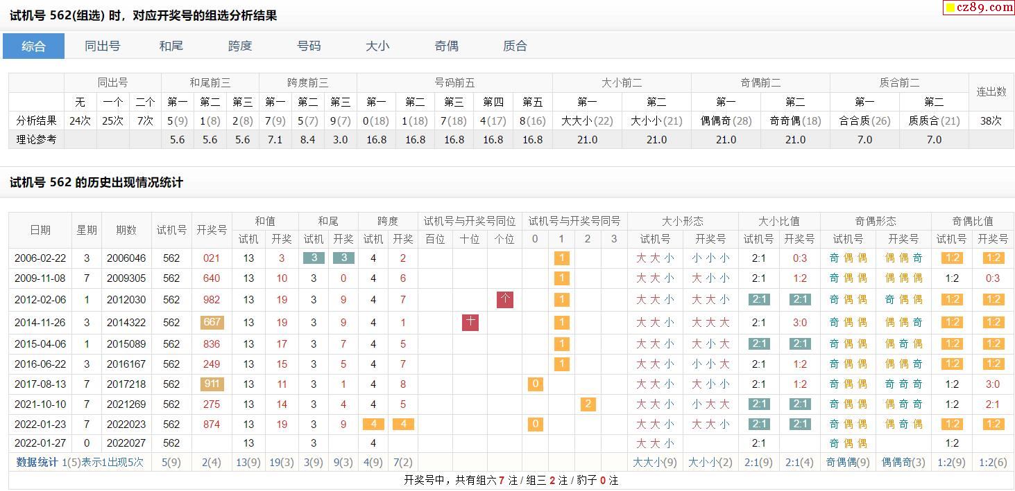 027期福彩3D试机号562对应开奖号的组选分析结果