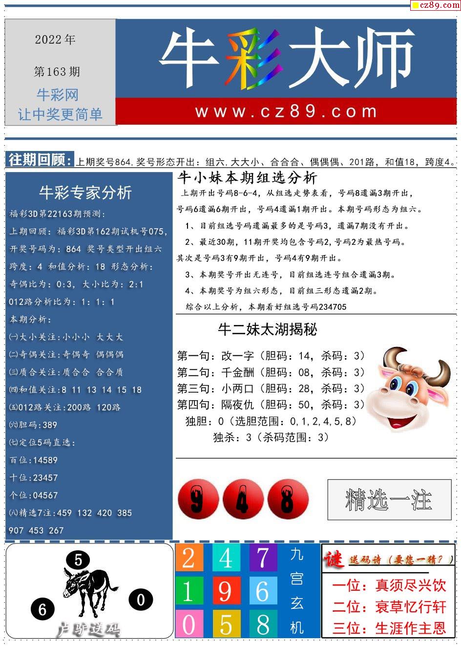 22年163期牛彩大师3D精华推荐