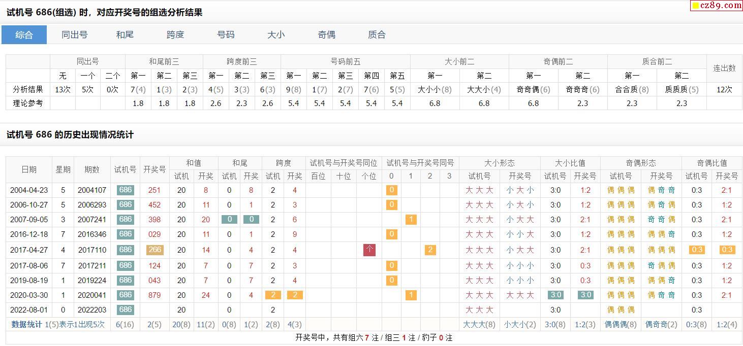 203期福彩3D试机号686对应开奖号的组选分析结果