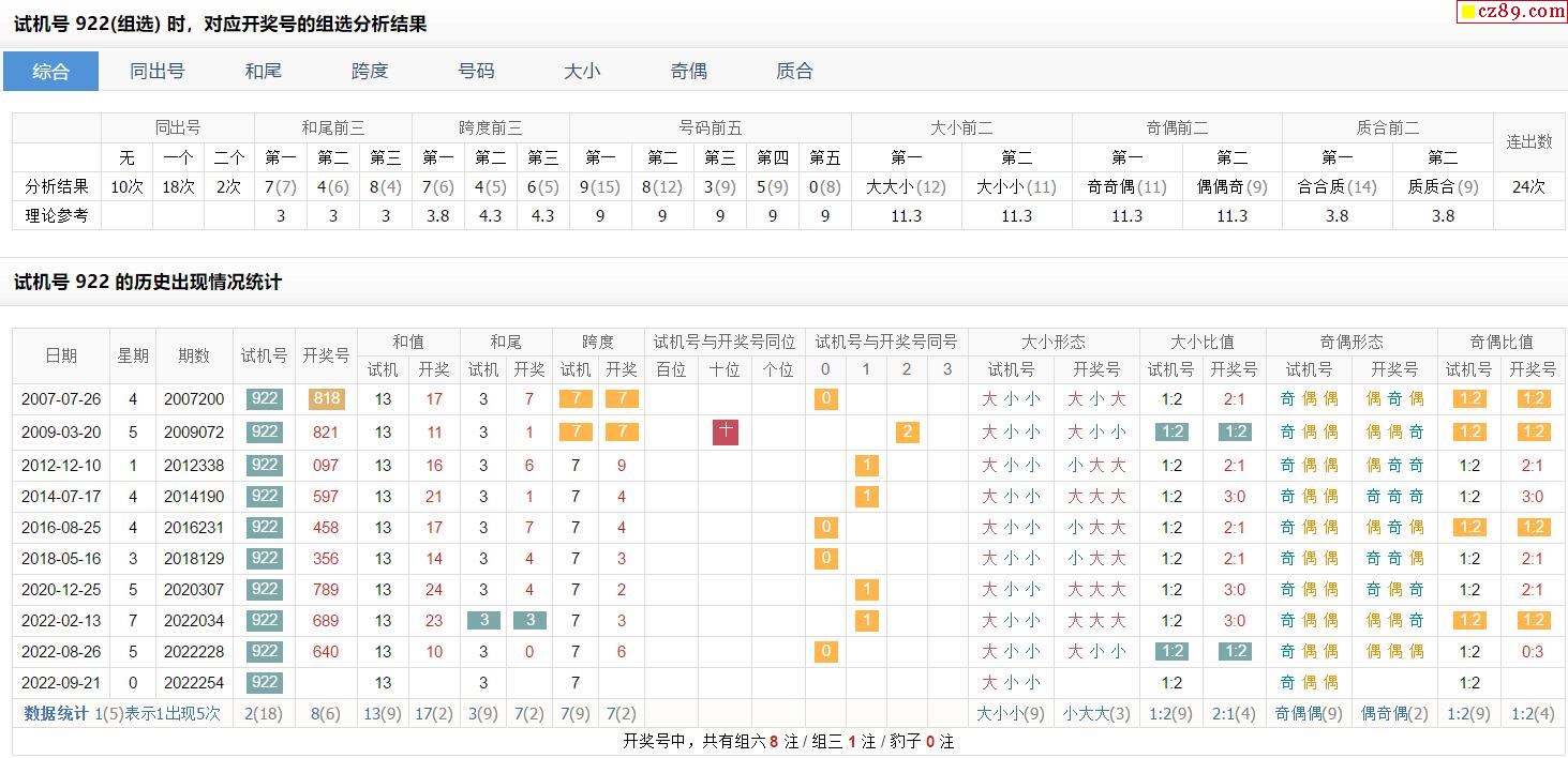 254期福彩3D试机号922对应开奖号的组选分析结果