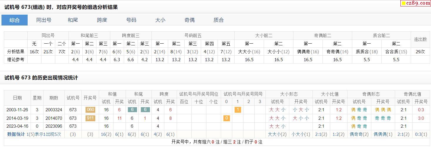 096期福彩3D试机号673对应开奖号的组选分析结果