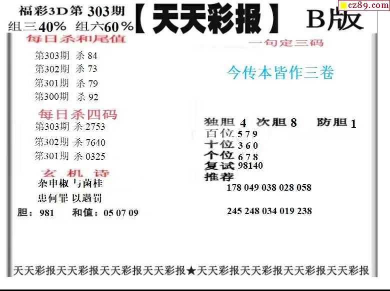 福彩3D2025303期天天彩报A版 天天彩报B版