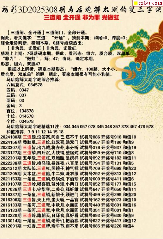 马后炮解25年308期3d太湖钓叟之 三道闸