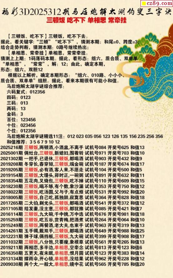 马后炮解25年312期3d太湖钓叟之 三顿饭