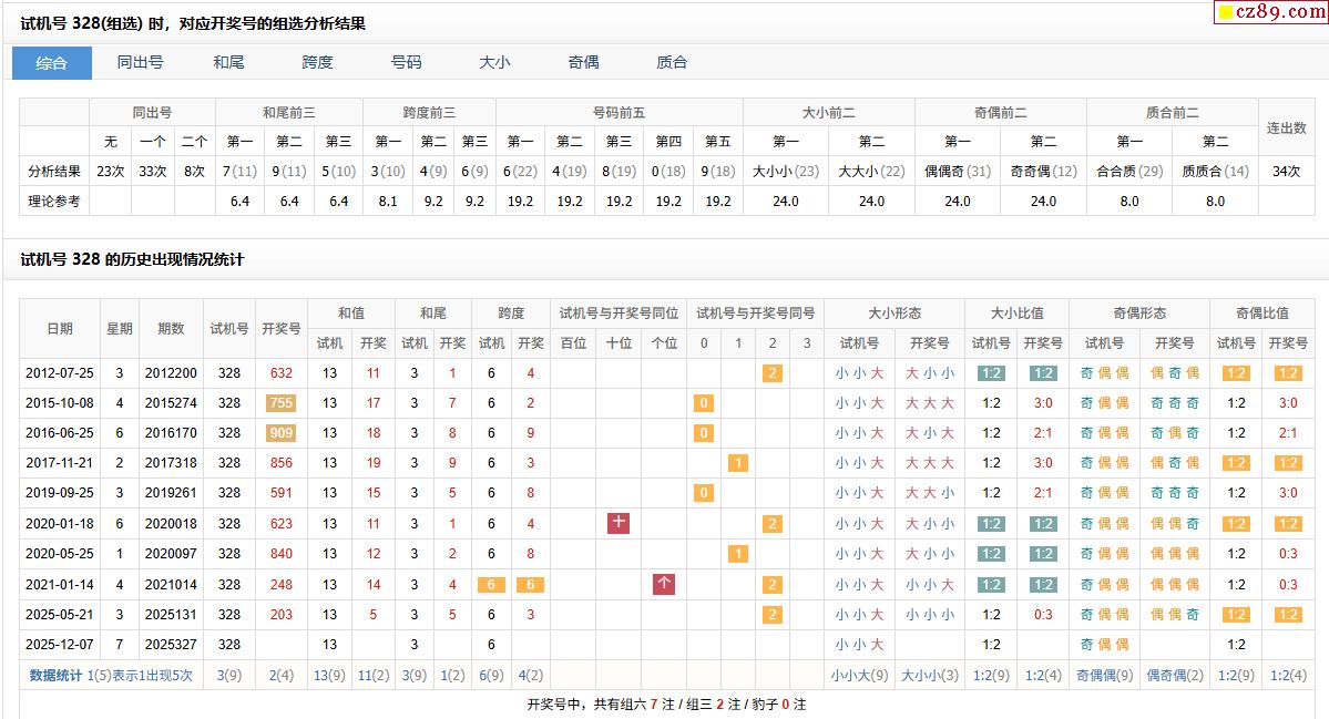 327期福彩3D试机号328对应开奖号的组选分析结果