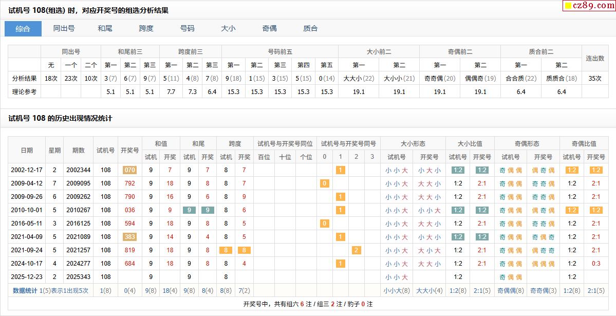 343期福彩3D试机号108对应开奖号的组选分析结果