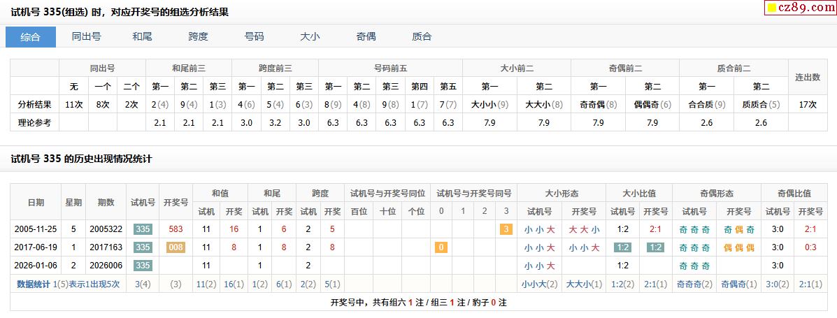 006期福彩3D试机号335对应开奖号的组选分析结果